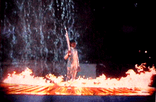The climax of the ceremony was the Olympic Torch entering the stadium, relayed by veteran Australian Olympic athletes of the 20th century and handed over to the Australian athlete Cathy Freeman, who was ringed by fire after lighting the Olympic flame. The flames rose above Ms Freeman, the 400m world champion, and moved up the stand to a final resting place over the stadium.